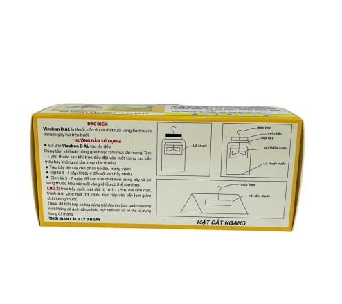 - Khi sử dụng: Mở nắp hai chai thuốc. Đổ hết thuốc diệt ruồi vào chai chất dẫn dụ, đậy nắp kín và lắc đều. Sau đó, tẩm khoảng 1-2ml hỗn hợp thuốc vào bẫy và treo lên cây.